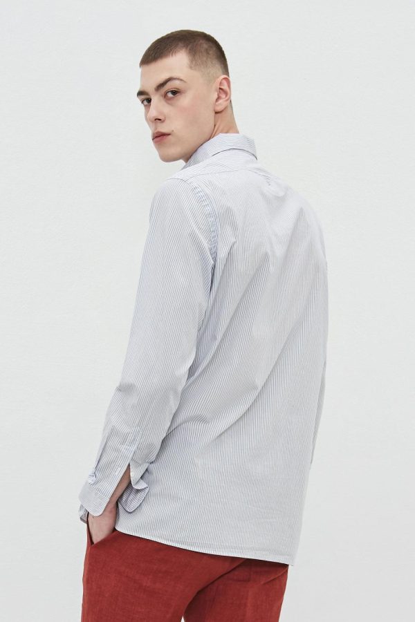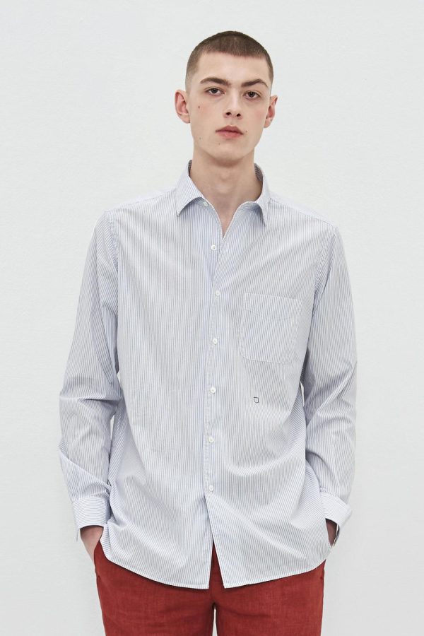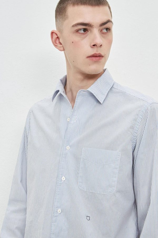 Regular-fit shirt with a chest patch pocket and pointed collar. No front placket, with badge embroidery for the customer’s initials and a pointed rear yoke. Made from linen. Made in Italy.