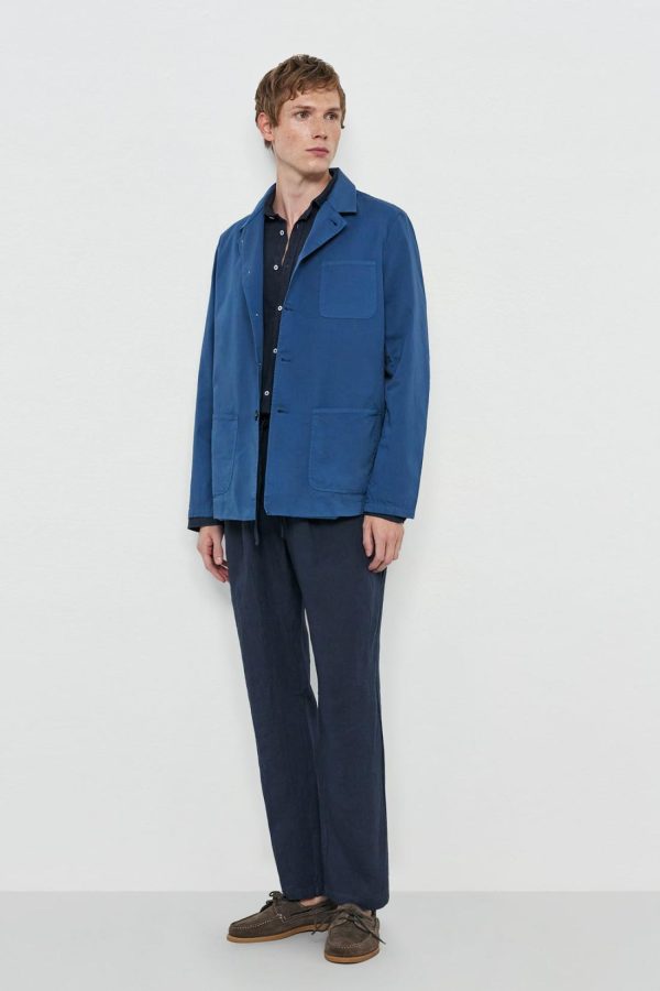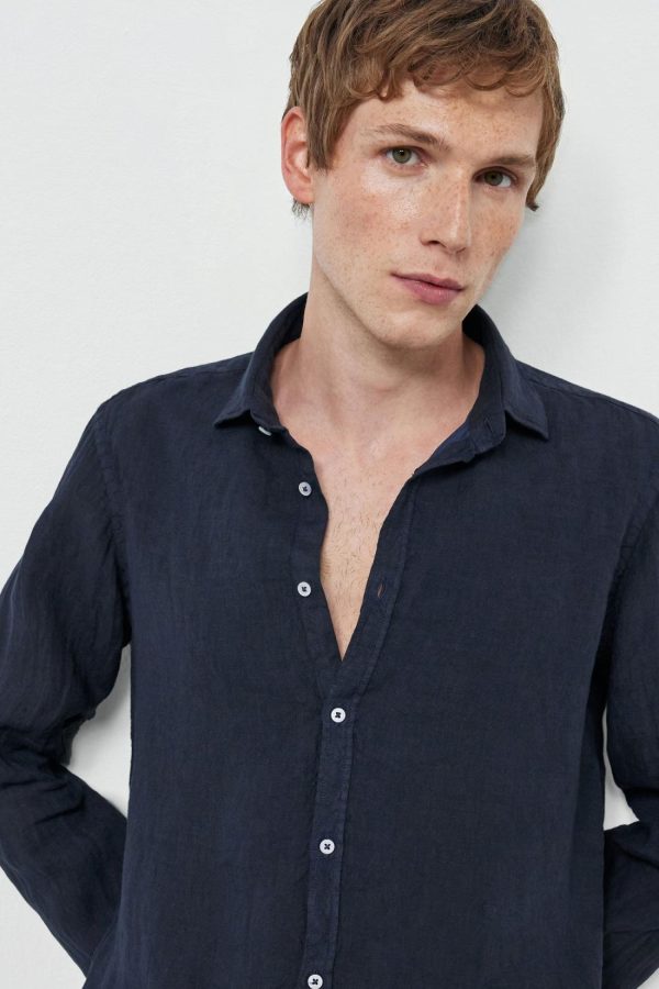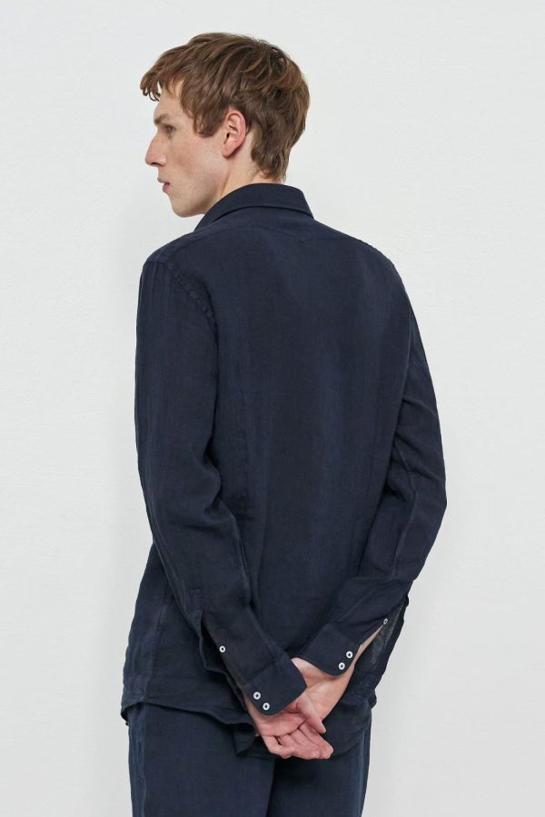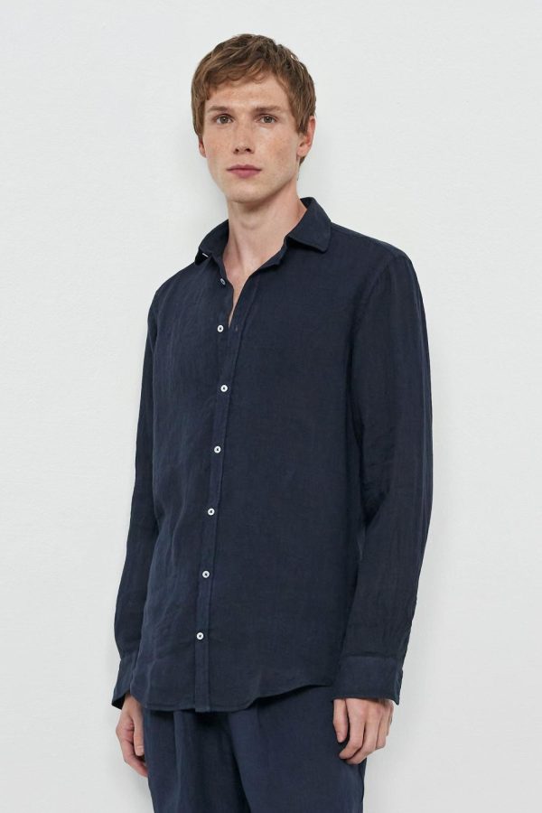 Soft-collar shirt with rounded tips, front closure, inner voile cotton bib detail, embroidered coat of arms for numbering, pointed back yoke with rounded bottom, regular fit, made in lightweight linen fabric. Made in Italy.