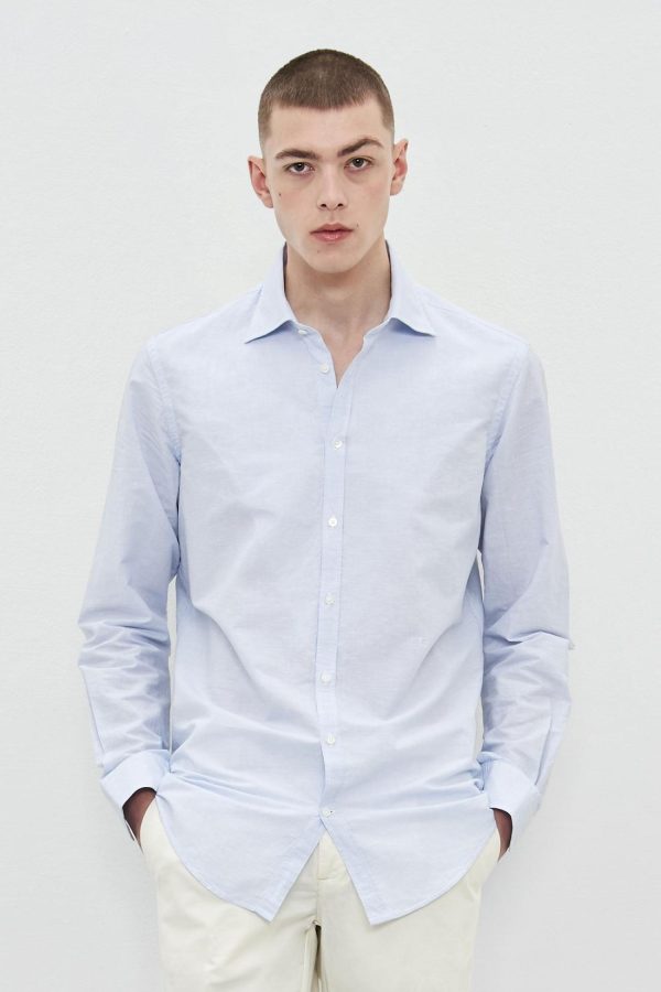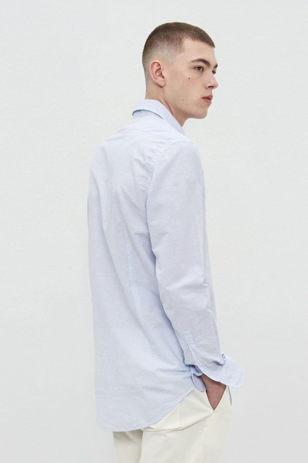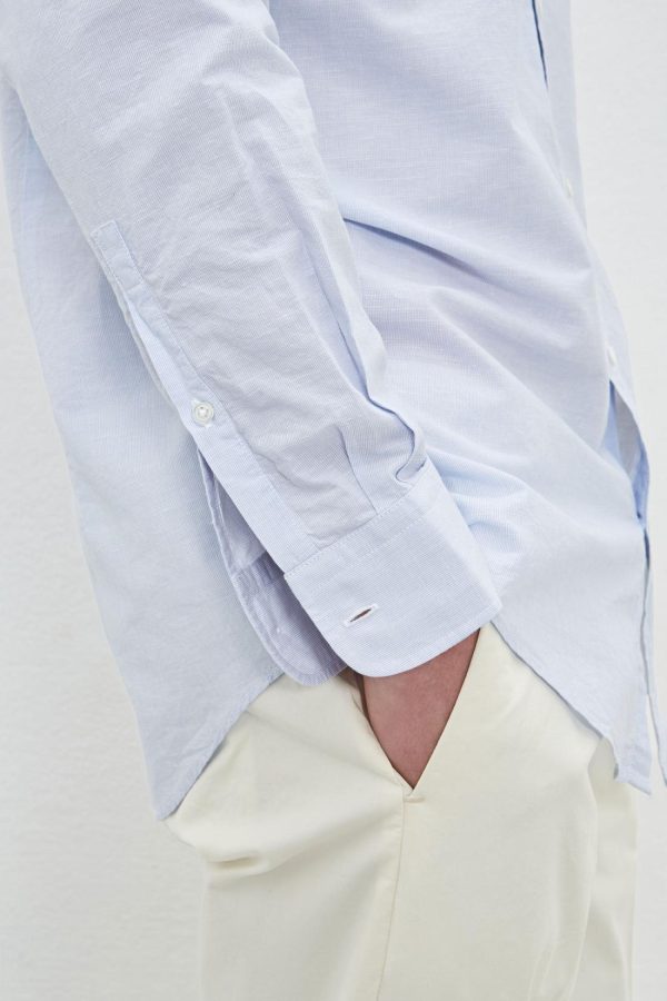 Regular-fit shirt with a pointed collar, classic soft front placket, and a cotton voilè inner bib. Made of striped cotton linen. Features custom badge embroidery for initials and a pointed rear yoke. Made in Italy.