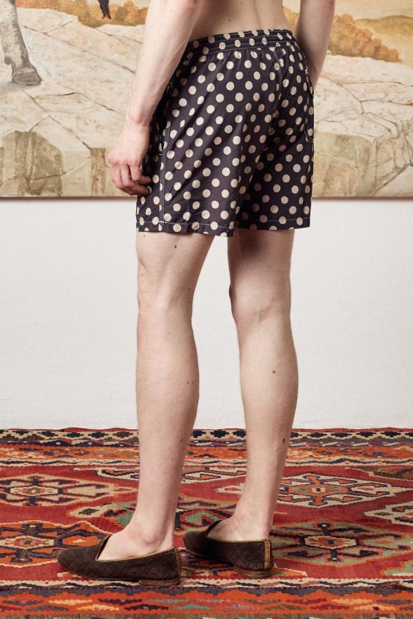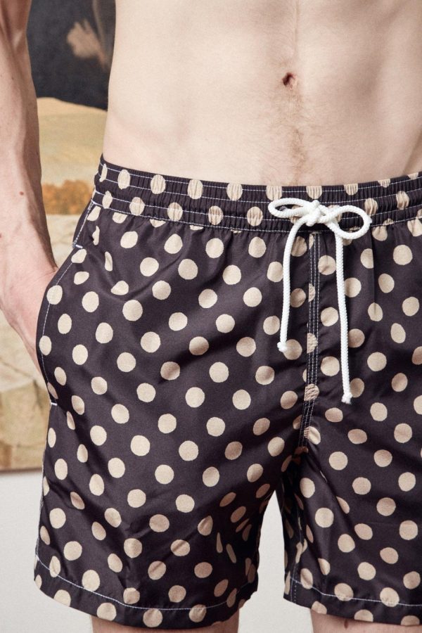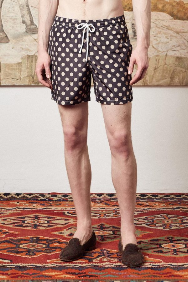 Classic fit swim shorts with drawstrings waistband, pockets and mesh slip lining.Made in an exclusive pois print. Made in Italy.