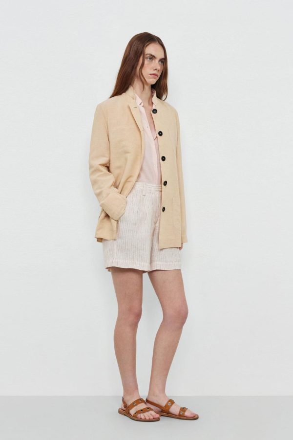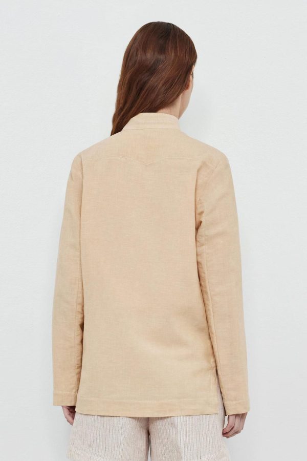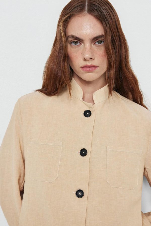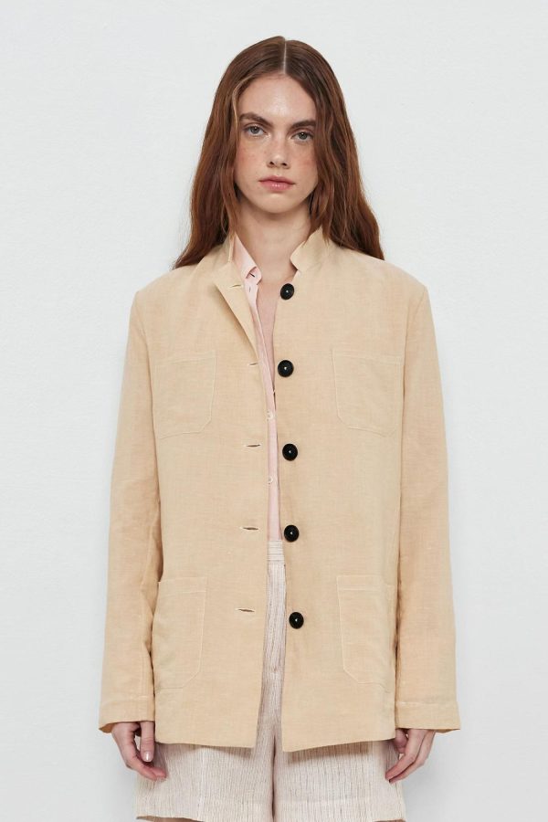 Deconstructed, linen cotton overshirt featuring a loose fit, a mandarin collar, five horn buttons, four patch pockets. Made in Italy.